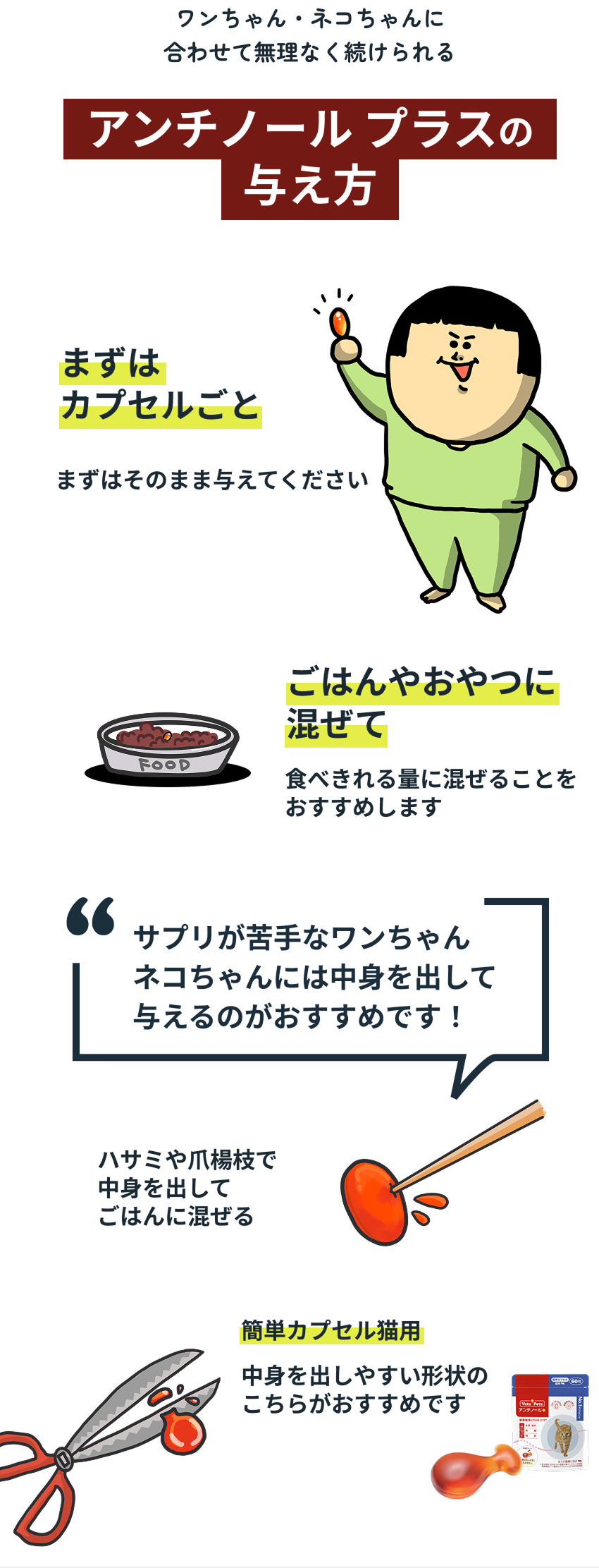 アンチノール プラスは100%ナチュラルオイルサプリメントです。高齢のワンちゃんやネコちゃん、また薬を服用している場合でも安心してご使用いただけます。ただし、健康状態に不安がある場合はかかりつけの動物病院にご相談していただくことをおすすめします。