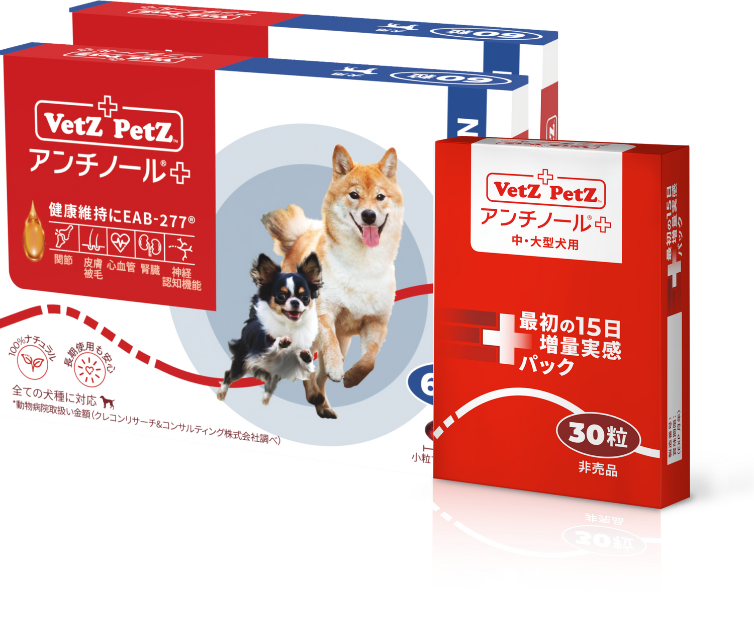 愛犬の体に栄養を満たすために、最初の15日間は2倍量を与えてください。 60日スターターキットでは、通常のアンチノール プラスに加えて、15日間の増量実感パックを無料でお届けします。